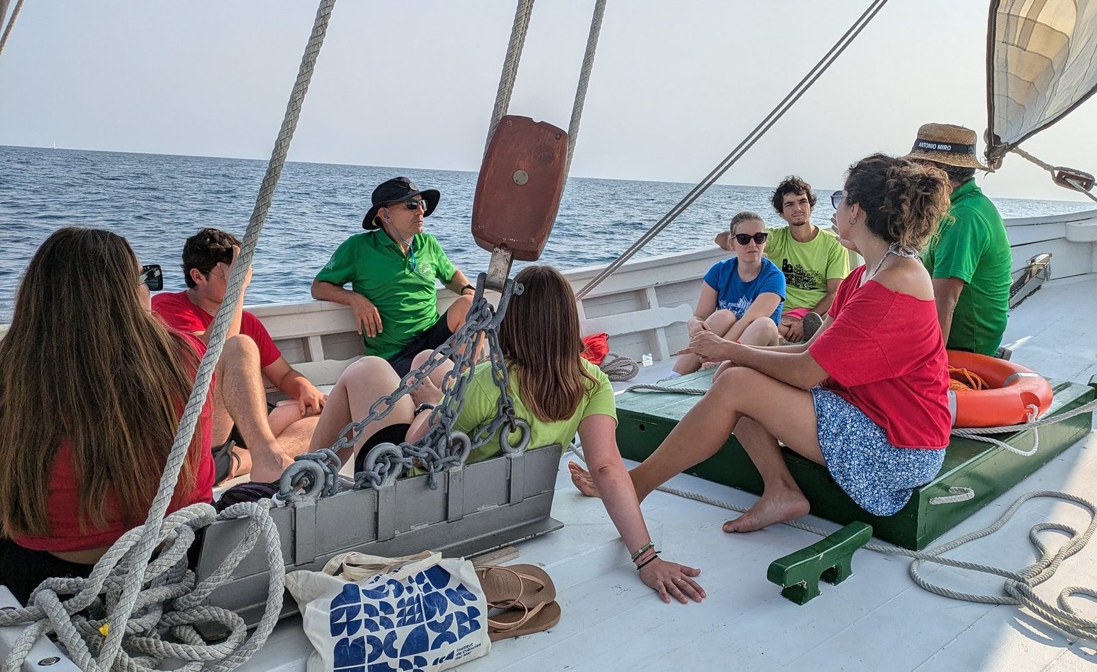 A las 5 de la tarde del lunes 19 de agosto de 2024 hemos quedado en el puerto de Segur con 8 chicos y chicas de Calafell: Cuatro miquelets (Alba Font, Georgina Porta, Julia Saéz, Toni Jaén), tres terrosos (Albert Roig, Anna Mañé, Manel Miravent) y una pulpita (Júlia Crespín). ¡He aquí! Los embarcamos y aprovechamos, mientras les hacemos trabajar un poco preparando la barca, a explicarles qué es y qué representa Francisca.